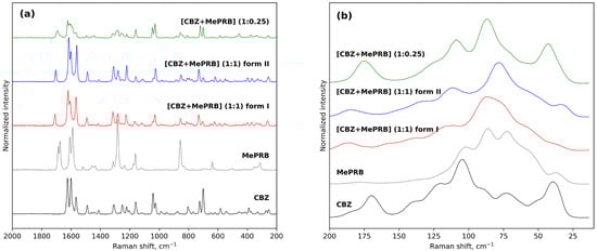 Experimental Raman spectra of CBZ, MePRB, [CBZ + MePRB] (1:1) form I and form II, and [CBZ + MePRB] (1:0.25) channel-like cocrystal in the mid-frequency (a) and low-frequency spectral (b) regions.