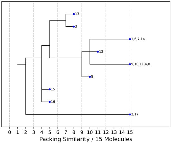 Packing similarity dendrogram for CBZ multicomponent crystals with >1:1 stoichiometric ratio. Structures grouped (e.g., 1, 6, 7, 14) on the right-hand side indicate that 15 out of 15 molecules in a cluster are similar, and these are considered to be isostructural. 1—[CBZ + MePRB] (1:0.25), 2—CBZ-4-aminosalicylic acid hydrate (2:1:1, FAYXUB), 3—CBZ-4-aminosalicylic acid methanol solvate (2:1:1, FAYYAI), 4—CBZ dihydrate (FEFNOT03), 5—CBZ furfural solvate (2:1, FOMXAH), 6—CBZ-4-aminobenzoic acid (4:1, INUZAU), 7—CBZ-4-hydroxybenzoic acid (MOXVIF02), 8—CBZ-malonic acid (MOXVUR), 9—CBZ-DL-tartaric acid (MOXWIG), 10—CBZ-maleic acid (MOXWOM), 11—CBZ-oxalic acid (MOXWUS), 12—CBZ-1,4-dioxane solvate (2:1, QABHOU01), 13—CBZ-anthranilic acid (2:1, RUTGOE), 14—CBZ-thiourea (2:1, UWAZID), 15—CBZ-4,4′-bipyridine (2:1, XAQQUC), 16—CBZ-4-aminobenzoic acid (2:1, XAQRAJ), 17—CBZ-4-aminobenzoic acid hydrate (2:1:1, XAQREN).