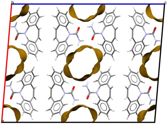 Fragment of packing arrangement and void maps in the crystal structures of the [CBZ + MePRB] (1:0.25) form. The disordered molecules of methylparaben are not shown. Color code: C, grey; H, white; N, blue; O, red.