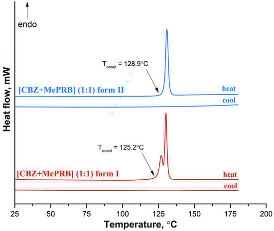 DSC curves for form I and form II of the [CBZ + MePRB] (1:1) cocrystal recorded at a heating rate of 10 K·min−1.