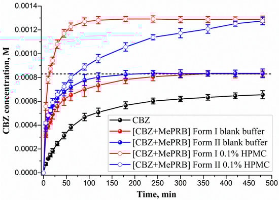 The ability of the studied cocrystals to generate and maintain supersaturation during the dissolution process was monitored under non-sink conditions in a pH 6.5 buffer solution at 37 °C (Figure 8). As Figure 8 illustrates, the polymorphs of [CBZ + MePRB] (1:1) showed similar dissolution profiles, whereas the parent CBZ was characterized by a much slower dissolution. The anhydrous form of CBZ is known to undergo a phase transformation to the dihydrate form in an aqueous medium. However, after 480 min of CBZ dissolution, the drug concentration was significantly lower than the equilibrium solubility of CBZ dihydrate ((8.30 ± 0.02)·10−4 M) due to the low dissolution rate of the compound. The PXRD analysis of the samples recovered after the dissolution experiment confirmed the partial phase conversion of the anhydrous CBZ to its dihydrate form (Figure S7a). Although the [CBZ + MePRB] (1:1) cocrystal was confirmed to be a more soluble than the parent drug, supersaturation was not observed during the dissolution test, presumably because of the rapid SMPT process and precipitation of CBZ dihydrate. The phase transformation of the cocrystal polymorphs to CBZ dihydrate was additionally verified by PXRD analysis of the residual solids after the dissolution experiments (Figure S7b,c). Both polymorphs of [CBZ + MePRB] (1:1), however, exhibited a high dissolution rate, reaching a plateau value equivalent to CBZ dihydrate equilibrium solubility within a few hours of the dissolution test. The reasons behind the improved dissolution rate could be attributed to the high solubility of MePRB with respect to CBZ and rapid cocrystal dissociation during the dissolution. Similar behavior has been reported in the literature for other CBZ cocrystals, and the use of pharmaceutically acceptable polymers has been proven to be an effective strategy for inhibiting the fast SMPT of cocrystals [,,]. In the present study, the HPMC excipient was employed owing to its ability to prevent CBZ from precipitating in the bulk phase within a few hours []. As Figure 8 shows, the presence of pre-dissolved HPMC (0.1% w/v) in the dissolution medium had a significant effect on the dissolution behavior of both polymorphs of the [CBZ + MePRB] (1:1) cocrystal. Considering the CBZ and MePRB concentration ratio during the dissolution experiment, [CBZ + MePRB] (1:1) form I exhibited incongruent dissolution, suggesting the cocrystal dissociation in the solid phase (Figure S8a). The dissolution profile of [CBZ + MePRB] (1:1) form I demonstrated a rapid increase in the CBZ concentration within the first 60 min of the experiment, reaching a plateau level at 120 min. The CBZ content at the end of the experiment was ca. 1.6 times higher than that of CBZ dihydrate. Interestingly, the PXRD analysis of the residual solid revealed the presence of anhydrous CBZ, while only traces of CBZ dihydrate were detected (Figure S7b). This is likely due to the reported ability of HPMC to inhibit the phase transformation of more soluble anhydrous CBZ to the dihydrate form [,]. In contrast, the dissolution of [CBZ + MePRB] form II in buffer solution with pre-dissolved HPMC was characterized by a congruent dissolution with a steady increase in the CBZ and MePRB concentration throughout the experiment (Figure S8b). Although the CBZ concentration values for both cocrystal polymorphs at the end of 480 min were comparable, it is clear that the drug concentration for the [CBZ + MePRB] form II had not reached a plateau level. The residual solid recovered after the cocrystal dissolution experiment was identified as [CBZ + MePRB] (1:1) form II by PXRD (Figure S7c). These results indicate that the addition of HPMC seems to completely inhibit the SMPT of the cocrystal to the parent drug for a relatively long time period, presenting a potential improvement in bioavailability.