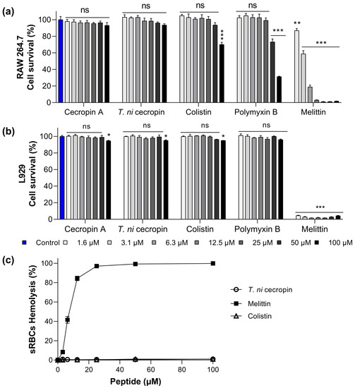 Cytotoxicity of peptides against (a) RAW 264.7 cells, (b) L929, and (c) sheep red blood cells (sRBCs). Data are presented as the mean ± SEM from triplicate experiments. * p < 0.05, ** p < 0.01, *** p < 0.001; and ns, nonsignificant compared to that in the non-treatment group (two-way analysis of variance).