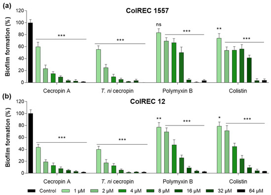 Inhibitory effects of peptides in biofilm assays performed in (a) ColREC 1557 and (b) ColREC 12. Data are presented as the mean ± SEM from triplicate experiments. * p < 0.05, ** p < 0.01, *** p < 0.001; and ns, nonsignificant compared to that in the non-treatment group (two-way ANOVA).