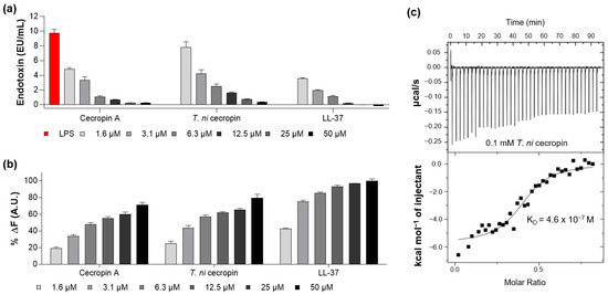Measurement of interaction between lipopolysaccharide (LPS) and peptides. (a) Limulus amebocyte lysate assay showing the LPS neutralization capacities of peptides. (b) BODIPY-TR-cadaverine displacement from LPS after treatment with peptides. (c) Isothermal titration calorimetry measurement showing the binding affinity of Trichoplusia ni cecropin (T. ni cecropin) (0.1 mM) to 0.025 mM LPS. Data are presented as the mean ± SEM from triplicate experiments. The concentration of the peptides at each x-axis is indicated at the bottom of (a,b) by the color notation.