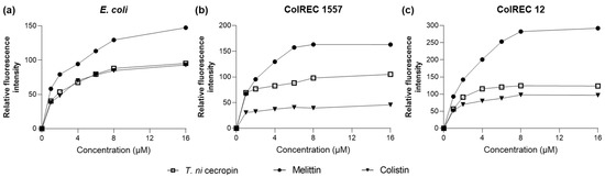 Fluorescence intensity as measured via peptide-induced membrane disruption. Relative fluorescence intensities in (a) E. coli, (b) ColREC 1557, and (c) ColREC 12 as measured using 1-N-phenylnaphthylamine uptake.