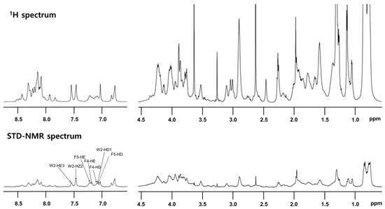 STD-NMR analysis was performed to specify the residues that interact with LPS. Peptide (0.5 mM) was reacted with 15 μM LPS. Notably, despite its high sequence homology with other cecropins, T. ni cecropin uniquely harbors an additional Phe at the fourth residue, substituting for Leu; thus, T. ni cecropin contains one Trp and two Phe residues. This difference may induce a strong interaction between T. ni cecropin and the bacterial membrane. The top spectrum in Figure 6 shows the reference spectrum of the free peptide, whereas the spectrum at the bottom shows the STD effect of the peptide bound to LPS (Figure 6 bottom). STD-NMR data showed that aromatic and amide protons, as well as aliphatic protons, contribute to the LPS interaction. Especially strong STD effects were identified at 7.0–7.7 ppm, corresponding to the aromatic ring protons of the Trp2, Phe4, and Phe5 shown in Figure 6, implying that these aromatic residues are important for interaction with LPS and the antibacterial activities of T. ni cecropin.