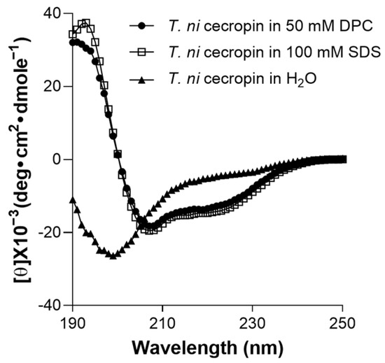 To determine the environment-dependent structure of the peptide, CD spectrum analysis was performed. T. ni cecropin was not structured in aqueous solution (Figure 7). However, in SDS micelles, which mimic negatively charged bacterial cells, or in DPC micelles, which mimic zwitterionic cell membranes, it was observed to adopt a helical structure with strong positive values at 192 nm and double minima at 208 and 222 nm, equivalent to the characteristics of the α-helical structures of cecropin A [57].