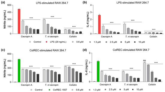 To investigate the inflammatory response induced by ColREC 1557, RAW 264.7 cells (1 × 105 cells/well) were treated with various concentrations of peptide (0.6 to 10 μM) 1 h before bacterial infection. The control was an untreated cell. ColREC 1557 that had been cultured in LB broth overnight and sub-cultured to the exponential phase were harvested, suspended in DMEM, and used to infect RAW 264.7 cells to a final concentration of 1 × 105 cells/well. Subsequent nitrite and IL-6 detection was performed as described in Section 2.15.