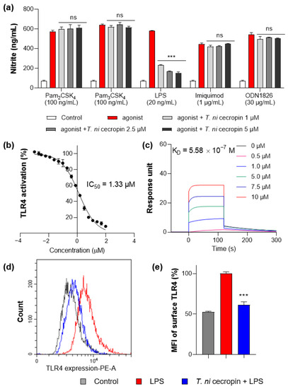 Measurement of interaction between Toll-like receptor 4 (TLR4) and peptides. (a) Specific agonist treatment for each TLR receptor shows TLR4 selectivity of T. ni cecropin. (b) Results of secreted embryonic alkaline phosphatase assay show the TLR4 inactivating effect of T. ni cecropin on LPS-stimulated human embryonic kidney-Blue hTLR4 cells. (c) Surface plasmon resonance sensorgrams of TLR4/MD-2 complex protein interaction with varying concentrations of T. ni cecropin. (d) Flow cytometry results showing the effect of T. ni cecropin on preventing TLR4 expression in LPS-stimulated cells and (e) indicating the mean fluorescence intensity (MFI) (%). Data are presented as the mean ± SEM from triplicate experiments. *** p < 0.001 and ns, nonsignificant compared to that in the agonist treatment group (a) (one-way ANOVA); *** p < 0.001 compared to that in the LPS group (e) (two-way ANOVA).