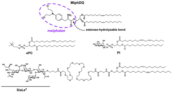 Structures of melphalan lipophilic prodrug (MlphDG), SiaLeX-conjugate, and representative structures of soybean phosphatidylinositol (PI) and egg phosphatidylcholine (ePC) used for liposome preparation.