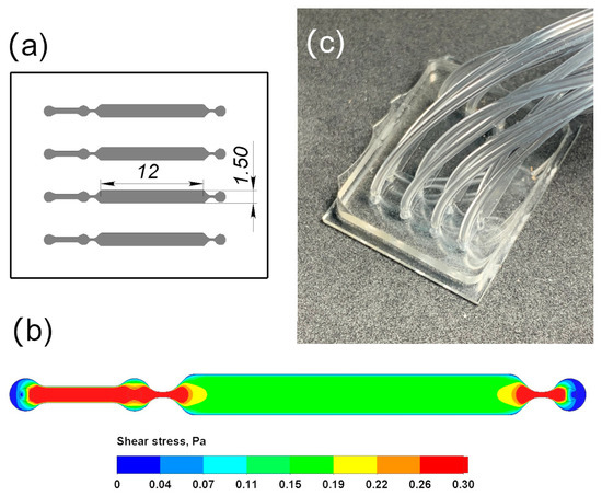 (a) The scheme of the microfluidic chip: channel width 1.5 mm, height 0.2 mm, length 12 mm. (b) Heat map of the shear stress distribution in the chip channel at a volumetric velocity of 100 µL/min. (c) Photo of the microfluidic chip.