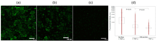 Monolayer of HUVEC cells internalizing 5SX liposomes. Images of microchannel fragments with HUVEC cells after activation for 4 h with 50 ng/mL TNF-α: (a) under static conditions, (b) under flow of 100 µL/min, or (c) under flow, without the activation. (d) Distribution of fluorescence intensities of HUVEC cells internalizing 5SX liposomes; data on internalization under static conditions (NO FLOW) or with a flow rate of 100 µL/min. Data are presented as medians, 25–75 percentiles, and ranges of values without outliers. Kruskal–Wallis criterion and the median test were used to compare the groups. The monolayer of cells seeded into the microchannels for 18 h was activated for 4 h with 50 ng/mL TNF-α. Control cells were not activated (–TNF-α). Then, the cells in the chip were exposed to a flow of liposome suspension in Fluorobrite with 20% FBS for 15 min.