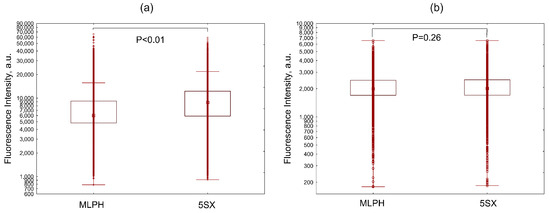Distribution of fluorescence intensities of HUVEC cells internalizing liposomes without a ligand (MLPH) or 5SX liposomes after activation with TNF-α (a) or without activation (b) in 20% FBS under a flow rate of 100 µL/min. Data are presented as medians, 25–75 percentiles, and ranges of values without outliers. Kruskal–Wallis criterion and the median test were used to compare the groups.