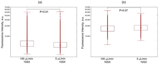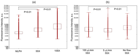 Comparison of distributions of fluorescence intensities of activated HUVEC cells internalizing: (a) liposomes with various content of the SiaLeX ligand: MLPH vs. 5SX and 10SX samples min at a flow rate of 100 µL/min, and (b) 5SX liposomes at a flow rate of 0, 5, and 100 µL/min. A monolayer of cells pre-seeded into the microchannels for 18 h was activated for 4 h with 50 ng/mL TNF-α, then exposed to the flow of a suspension of liposomes in the blood serum of healthy donors for 15 min. Data are presented as medians, 25–75 percentiles, and ranges of values without outliers. Kruskal–Wallis criterion and the median test were used to compare the groups.