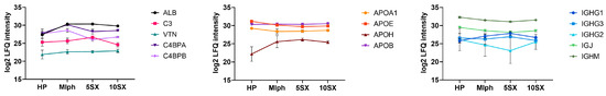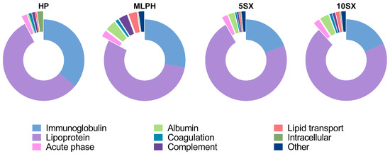 In order to evaluate the content of the proteins in each experimental group of samples, the relative protein abundance, RPA (%), was calculated based on the iBAQ values. For this, the sum of the iBAQ values in the technical replicates for each protein was divided by the sum of iBAQ values for all identified proteins in the sample and multiplied by 100%. Statistical analysis of proteomic data was carried out using the Perseus v.1.6.15.0 software. In order to compare proteins between samples, the protein iBAQ (to calculate relative protein abundance or RPA %) or LFQ (to compare protein intensities between samples) values of the samples were loaded into the program, including technical replicates. Four groups were formed: control plasma, MLPH, 5SX, and 10SX (three or four replicates for two independent samples each). The data were filtered out beforehand: possible contaminant proteins and false positive identifications were removed; proteins identified by two or more peptides and present in at least 70% of samples in at least one isolated group were left for analysis. Then, data were log2-transformed and normalized using the z-score function. Missing values were replaced from the normal distribution. In order to determine statistically significant differences between the groups, the multi-sample ANOVA with post-hoc Tuckey’s HSD test (FDR 0.05) was used. Statistically significant differences were considered with a fold change > 2 and a value of q < 0.01.