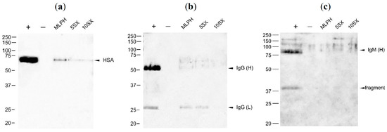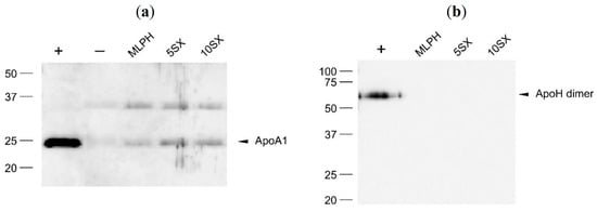 Delipidization was performed as described in [60] and in our recent study [52]. The resulting protein samples were dissolved in 36 μL of 2× standard reducing buffer for SDS-PAGE and boiled 2 × 2 min. SDS-PAGE was carried out in 6% concentrating and 12% separating gels on a Mini Gel Tank (Thermo Fisher Scientific, Waltham, MA, USA) setup for 47 min at 200 V. Precision Plus ProteinTMDual Color Standards (Bio-Rad Laboratories, Inc., Hercules, CA, USA) was used as molecular weight marker. Proteins were visualized by silver staining or transferred to a PVDF membrane using the Mini Gel Tank (Thermo Fisher Scientific, Waltham, MA, USA) at 20 V for 60 min. After the end of the transfer, the membrane was washed with TBS and, to prevent non-specific sorption, incubated in 5% low-fat dry milk in TBS with 0.1% Tween 20 (TBS/T) for 1 h at room temperature. Then, the membrane was washed with TBS/T (3 × 5 min) and incubated with primary antibodies (anti-IgG, IgM, C3, C4BP, fI, Vne, HSA, ApoA1, ApoE, ApoH) in 0.5% BSA solution for 2 h at room temperature. After that, the membrane was washed with TBS/T (15 min and 3 × 5 min), incubated with secondary antibodies conjugated with horse-radish peroxidase at 4 °C overnight, and then washed again with TBS/T 5 × 5 min. Immunodetection was performed with Clarity™ ECL Western Blotting Substrate (Bio-Rad) reagent and a VersaDoc 4000 (Bio-Rad) system.
