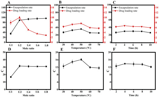These results demonstrated the effect of the molar ratio of the progesterone inclusion complex. At a molar ratio of 1:4, the encapsulation rate increased marginally with HP-β-CD. Finally, the loading rate was increased to a maximum of 1:2 by using HP-β-CD (Figure 1A,D).