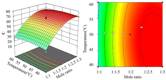 The design and results of the star point response surface experiments are shown in Table 1. The data were analyzed using Design-Expert software, which shows that the model is highly significant and the misfit term is not significant, proving that the model can evaluate the relationship between the molar ratio, temperature, and the overall score well. The results of the ANOVA on the data are shown in Table 2. A (mole ratio), A2 (quadratic effect of molarity), and B2 (quadratic effect of temperature) had a highly significant effect on the model, and there was no interaction between AB (molarity and temperature).