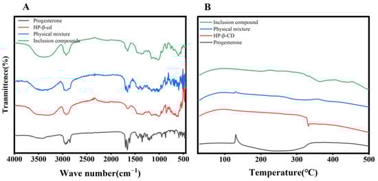 Suitable amounts of progesterone, HP-β-CD, progesterone–HP-β-CD inclusion complex, and a mixture of progesterone and HP-β-CD (1:2.16) were placed in a container at a temperature rate of 10 °C·min−1, a differential heat procedure of 50 V, a temperature rise range of 30–500 °C, and a nitrogen atmosphere (STA 449 f3, NETZSCH, Co., Ltd., Selb, Germany).