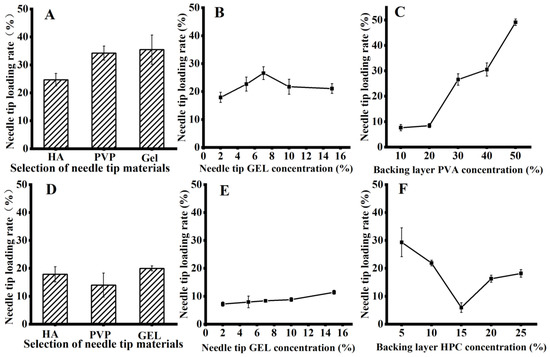 (A). Screening of tip materials when using PVA as the backing layer. (B). Screening of tip material GEL concentration when using PVA as the backing layer. (C). Screening of PVA concentration of backing material when using PVA as the backing layer. (D). Screening of tip materials when using HPC as the backing layer. (E). Screening of tip material GEL concentration when using HPC as the backing layer. (F). Screening of HPC concentration of backing material.