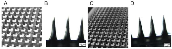 Dissolving microneedles are microneedle preparations that are usually prepared using soluble material. After application to the skin, the tip of the microneedle dissolves in the subcutaneous tissue and releases the drug [35]. The dissolving microneedles were prepared using a two-step method. The microneedle tip, which usually contains the drug, was prepared first, and the backing layer of the microneedle was prepared later [36]. The backing layer can be made from a soft material.