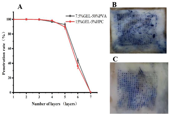 A sealing film puncture test was performed to assess the mechanical strength of the microneedles. Because the skin is elastic, the experiment used ten layers of parafilm sealing film. Two types of microneedles were applied to ten layers of parafilm sealing film (thickness of each layer: 127 μm) with a specific force (approximately 70 N), and the number of microneedles passing through each layer of the sealing film was recorded and measured three times in parallel. The penetration rate was calculated using the following formula: penetration rate% = (number of microneedles penetrating each layer of sealing film/total number of microneedles per piece) × 100%, and the mechanical properties of a self-made microneedle were evaluated.