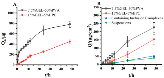 The experimental results showed that the progesterone inclusion microneedles released 781.80 ± 61.14 µg of 7.5% GEL-50% PVA and 448.46 ± 33.08 µg of 15% GEL-5% HPC at 46 h in a 20% ethanol-saline solution. According to the results of the experiments, microneedles with high tip drug utilization have faster in vitro release. The release curves are shown in Figure 7A.