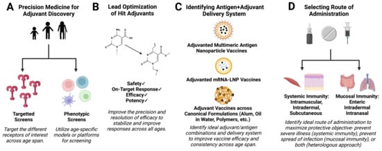 A precision-vaccinology approach to discovery and development of adjuvanted vaccines targeted to distinct vulnerable populations. Focusing discovery and innovation efforts to better understand the phenotypic and mechanistic differences in the immune systems of diverse populations, emerging research in vaccine development has explored how to optimize immunizations across the lifespan. Key elements of the precision-vaccinology approach, as applied to epidemic/pandemic response and preparedness, include (A) selecting robust adjuvants optimized for a target population, (B) modifying the chemical structure of lead adjuvants for defined functionality, (C) optimizing antigen and adjuvant compositions with the appropriate formulation systems, and (D) selecting appropriate route of administration for targeted protective correlate(s).