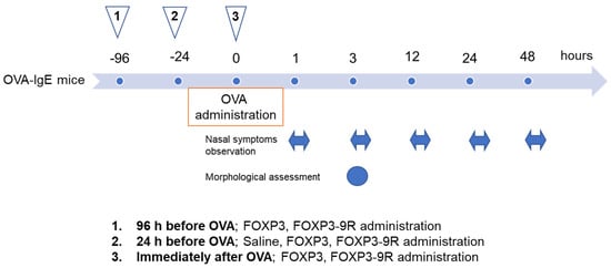 FOXP3-9R and FOXP3 (control) proteins (10 µL aliquots, 0.1 mg/mL) were administered into the bilateral nasal cavities of the animals (5 mice/group) using a micropipette (“QSP, l0 µL filter tips; Thermo Fisher Scientific, Waltham, MA, USA). Before nasal administration, the micropipette tip was positioned 1–2 mm from the entrance of the nasal cavity while mice were awake in the supine position. After nasal treatment, mice were placed in a prone posture for 30 min. We divided the OVA-IgE mice into 6 groups: FOXP3 96 h before OVA (FOXP3 injected 96 h before OVA administration), FOXP3-9R 96 h before OVA (FOXP3-9R injected 96 h before OVA administration), FOXP3 24 h before OVA (FOXP3 injected 24 h before OVA administration), FOXP3-9R 24 h before OVA (FOXP3-9R injected 24 h before OVA administration), FOXP3 immediately after OVA (FOXP3 injected immediately after OVA administration), and FOXP3-9R immediately after OVA groups (FOXP3-9R injected immediately after OVA administration). An overview of the experimental procedure is illustrated in Figure 1.