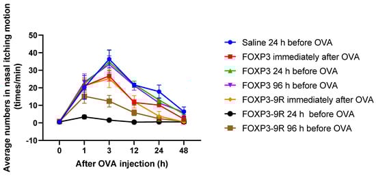 Nasal itching in OVA-IgE mice was investigated to assess the allergic reaction induced by intraperitoneal administration of OVA. Following FOXP3-9R, FOXP3, or saline administration, mice were observed for itching for 10 min, after a 10 min adaptation period at each time point [23], on days 1 (3 h, 12 h), 2 (24 h), and 3 (48 h) (Figure 1).