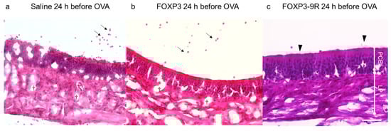 We performed H&E staining of the nasal epithelium of mice receiving FOXP3-9R or FOXP3 injection 24 h before OVA administration. Mice in the FOXP3 24 h before OVA and saline groups showed mucosal edema or eosinophil infiltration and dilated secretory ducts of the lamina (Figure 3). Conversely, the pseudostratified columnar epithelium structure was normal in the FOXP3-9R 24 h before OVA group; in this group, kinocilia were uniform on the epithelial surface. Moreover, the secretory ducts of the lamina propria were not dilated, and there was no evidence of mucosal edema or eosinophil infiltration in this group of animals (Figure 3).