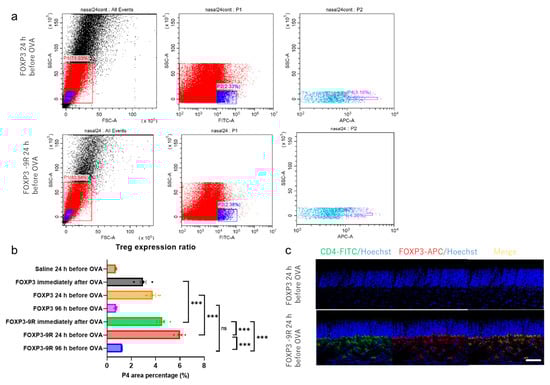 Flow cytometric analysis and immunohistochemistry. (a) Treg-like cells expressed in the nasal epithelium. FITC and APC were conjugated to CD4 and FOXP3, respectively. The P4 population was indicated in the CD4+ FOXP3+ cells (Treg-like cells). (b) The P4 area percentage in each treatment group. Statistical comparisons between the FOXP3 and FOXP3-9R groups and among FOXP3-9R groups alone are depicted in the graph. (c) Immunohistochemistry findings. Green, red, and blue indicate CD4-FITC, FOXP3-APC, and Hoechst staining, respectively. ***: p < 0.001. ns = not significant. Scale bar: 50 µm.