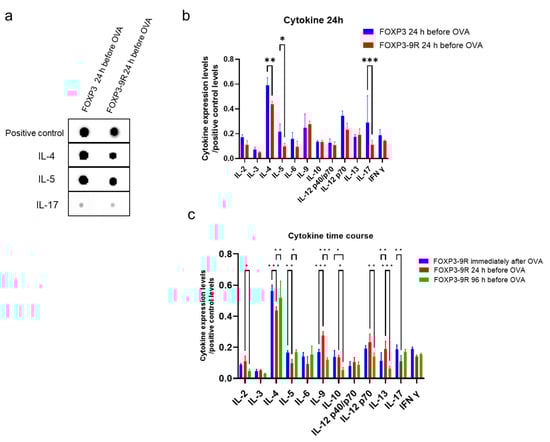 Cytokine assay. (a) Dot blot assay. (b) Comparison between FOXP3 and FOXP3-9R 24 h before OVA groups. (c) Changes in cytokine expression levels among FOXP3-9R groups. *: p < 0.05, **: p < 0.01, ***: p < 0.001.