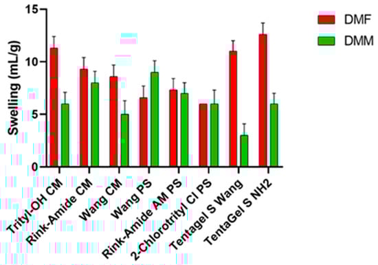 A good solvent should adequately swell a variety commercially available resins, demonstrating broad applicability to SPPS. The choice of resin is crucial because, along with the linker, it determines the functional group of the C-terminal and the synthetic strategy [22,23]. For this test, different resins were selected: resins based on polystyrene (PS), polyethylene glycol (PEG) resins functionalized with PS, and resins consisting 100% of PEG. Polystyrene resins contain 1–2% divinyl benzene (DVB), which forms a lattice between polystyrene monomers and provides rigidity to the resin itself and better swell in non-polar solvents. TentaGel (TG) resins consist of PEG (50–70%) bonded to a low cross-linking polystyrene base and swell in both polar and non-polar solvents. Finally, ChemMatrix, a totally PEG resin, has better swelling properties in most of the solvents used in SPPS [24], making it suitable for microwave-assisted synthesis. During the swelling test (Figure 1), resin was introduced in a syringe and swelled for 45 min under shaking with the selected solvent (DMF or DMM). Then, the solvent was removed from under vacuum, and the swelling degree was evaluated using the formula described above. These values were compared to the values obtained when using DMF. As shown in Figure 1, TentaGel resins, Trityl, and Wang ChemMatrix show a lower degree of swelling in the green solvent, while Rink amide resins and the 2-chlorotrityl resin have almost the same degree of swelling in both solvents. Finally, DMM is able to swell Wang PS resin better than DMF. Ethers are unresponsive substances, making them good solvents for reactions. Most ethers are polar, but DMM has a relatively high molecular weight, giving it both hydrophilic and lipophilic properties. This may explain why it is able to swell polystyrene-based resins.