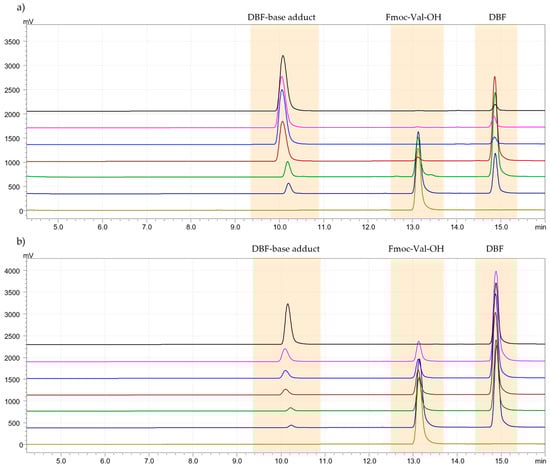 (a). Chromatogram of Fmoc-Val-OH deprotection kinetics test with the 20% solution of piperidine in DMF. Legend: t0 = 0 min (light green), t1 = 2 min (blue), t2 = 4 min (green), t3 = 6 min (red), t4 = 8 min (light blue), t5 = 15 min (pink), t6 = 30 min (black). (b). Chromatogram of Fmoc-Val-OH deprotection kinetics test with the 20% solution of piperidine in DMM. Legend: t0 = 0 min (light green), t1 = 2 min (blue), t2 = 4 min (green), t3 = 6 min (red), t4 = 8 min (light blue), t5 = 15 min (pink), t6 = 30 min (black).