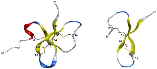 Three-dimensional structure of PaD (left) and Ct_PaD (right) as predicted by AlphaFold []. https://colab.research.google.com/github/deepmind/alphafold/blob/main/notebooks/AlphaFold.ipynb: accessed on 12 April 2022. Tertiary structures are represented using MOE software: Helix is red, β-strand is in yellow, turn is in blue, and ribbon loop is in gray. Disulfide bonds are displayed in yellow.