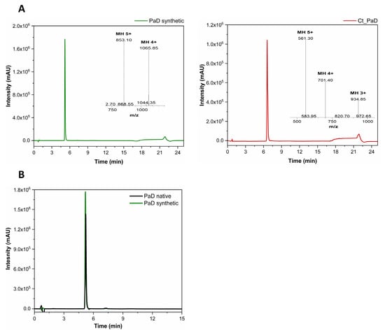 LC-MS was performed on a 2010EV instrument (Shimadzu) fitted with an Aeris Widepore XB-C18 column (150 × 4.6 mm, 3.6 µm, Phenomenex), eluting with linear gradients of solvent B [0.08% formic acid (FA) in ACN] into A (0.1% FA in H2O) over 15 min at a 1 mL/min flow rate. Fractions of >95% HPLC homogeneity and the expected mass (4260.5 Da and 2801.6 Da for PaD and Ct_PaD precursors, respectively) were pooled and lyophilized.