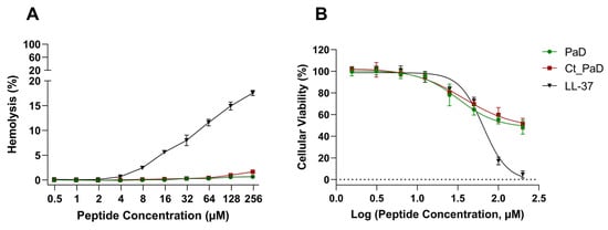 The cytotoxicity of PaD and Ct_PaD was first determined as horse red blood cell lysis, monitored by hemoglobin release, at 540 nm []. PaD, Ct_PaD, and the reference peptide LL-37 were tested up to 250 μM. The results in Figure 3A and Table 3 confirm the absence of hemolytic activity in both synthetic PaD and Ct_PaD, as previously shown for the native material [].