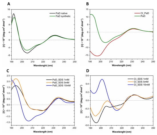 To analyze PaD and Ct_PaD structures in a membrane-like environment, we used SDS at concentrations above and below the critical micellar concentration (CMC, 7–10 mM) []. As seen in Figure 7C, PaD exhibits a helical structure in the presence of SDS monomers (1 and 5 mM), with a maximum between 190 and 195 nm and a minimum of 206 nm and 222 nm. In micelles (10 mM SDS), the relative intensities of the 206 nm and 222 nm minima are inverted, with the latter slightly shifted toward 218 nm, in tune with other described α + β fold CD signatures [,].