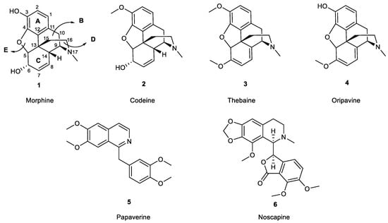 Natural products and their derivatives have historically played a significant role in drug discovery [1]. In 1805, the German chemist F. W. A. Sertürner isolated morphine from Papaver somniferum for the first time, which became a widely used medication to alleviate pain in the clinic [2]. In 1925, Robert Robinson proposed the chemical structure of morphine, and it was finally confirmed by X-ray crystallography in 1968. Codeine was isolated in 1832 by P. Robiquet [3]. Morphine is regarded as the “gold-standard” treatment for chronic and severe pain to which all other μ-agonists are compared. Morphine (4–20%) and codeine (0.7–5%) are the two major components of the opium poppy. Later, it was discovered that the latex of opium poppies contains other significant alkaloids, such as thebaine, papaverine, oripavine, and noscapine [4]. The structures of the most common alkaloids in opium poppy are depicted in the Figure 1.