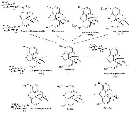 - Andersson, M.; Björkhem-Bergman, L.; Ekström, L.; Bergqvist, L.; Lagercrantz, H.; Rane, A.; Beck, O. Detection of morphine-3-sulfate and morphine-6-sulfate in human urine and plasma, and formation in liver cytosol. Pharmacol. Res. Perspect. 2014, 2, e00071. [Google Scholar] [CrossRef]