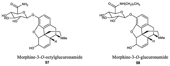 In 2012, Salvatella et al. synthesized two lipophilic analogues of M3G by forming an amide bond between a primary alkylamine and carboxylic acid group of M3G [54]. The synthesis procedures were explained in detail in the review of sugar derivatives of morphine by Jash and Gorai [55]. A surprising result of biological activity in rats and mice showed that increasing lipophilicity by an aliphatic octyl chain produced highly toxic derivative 58. The opioid antagonist activity of 57 showed the same properties as naloxone without being toxic (Figure 3).