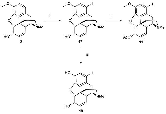 In 1997, Liebman and co-workers reported the synthesis of 1-iodomorphine 18 and 1-iodocodeine 17 [39]. Aiming to obtain 1-iodocodeine (17), a solution of codeine 2 in HCl was added to sodium iodide and chloramine T. Under these conditions, no obvious reaction occurred with morphine. Therefore, 1-iodomorphine (18) was synthesized through an O-demethylation of codeine derivative 17 with BBr3. Compound 19 was obtained after acetylation of 17 with acetic anhydride, and its structure was confirmed by crystallography (Scheme 4).