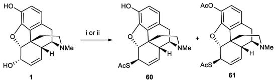 Compounds 59a–c were also synthesized via the Mitsunobu reaction [29,58]. The hydrochloride salts of codeine and morphine were reacted with azocarboxylates (DEAD or DIAD) in the presence of triphenylphosphine. It was shown that the hydrogen halide produced in situ in this reaction can act as an acid component. The reaction proceeded with chloride and bromide with an inversion of configuration at the C6 position to obtain 59a–c (Scheme 18).