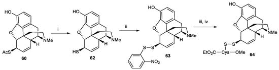 In 1988, Fujii et al. reported the novel analogues of 6-β-thiomorphine [59]. The C6-hydroxyl group was replaced with the thiol group. Two independent procedures were examined to synthesize compounds 60 and 61. In the first step, morphine was treated with thioacetic acid and N,N-dimethylformamide dineopentyl acetal. This reaction resulted in the formation of 61 as the major product. In the second procedure, morphine underwent the Mitsunobu reaction with thioacetic acid and triphenylphosphine (PPh3) in the presence of diisopropyl azodicarboxylate (DIAD). In this reaction compound 60 was prepared in 73% yield as the major product (Scheme 19). The stereochemistry of 60 and 61 at the C6 position was assigned as the β-orientation based on 1H-NMR spectroscopy. Compound 63 underwent the reaction with L-cysteine methyl ester followed by ethyl chloroformate and K2CO3, producing carbamate 64 (Scheme 20). It has been demonstrated that this sulfhydryl morphine derivative 63 binds to the μ-receptors from the disulfide bond [60]. Furthermore, the analgesic activity of compound 60 was five times higher than morphine in rats.
