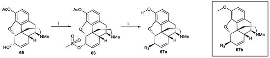 In 1968, Makleit and Bognár reported the new derivative of morphine and codeine that obtained much attention in the following years [67]. 6-Deoxy-6-azido-dihydroisomorphine (azidomorphine 67a) and d 6-deoxy-6-azido-dihydroisocodeine (azidocodeine 67b) were synthesized. It was demonstrated that azidomorphine has 40 to 300 times, and azidocodeine has about 13 times, more potency than morphine in animal [68] and human [69] clinical trial studies. The ED50 of 67a and 67b in the tail flick and hot plate test were reported in Table 4 [70]. It has been demonstrated that the incidence of side effects was significantly decreased in patients who were treated with azidomorphine. The reaction of 65 with methanesulfonyl chloride and pyridine yielded compound 66. Treatment of mesylates 66 with sodium azide through an SN2 reaction with inversion of configuration followed by removal of the 3-acetyl group led to the formation of azidomorphine 67a (Scheme 21) [71]. The dependence liability and tolerance of azidomorphine in mice and rats were much lower than that of morphine [72].