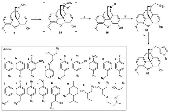 - Gharehnaghadeh, S.; Salehi, P.; Bararjanian, M.; Pecio, Ł.; Babanezhad-Harikandei, K.; Khoramjouy, M.; Shahhosseini, S.; Faizi, M. Novel Triazole-Tethered Derivatives of Nor-codeine: Synthesis, Radioligand Binding Assay, Docking Study and Evaluation of Their Analgesic Properties. Chemistryselect 2020, 5, 14753–14758. [Google Scholar] [CrossRef]