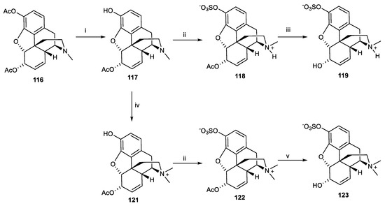 - Váradi, A.; Gergely, A.; Béni, S.; Jankovics, P.; Noszál, B.; Hosztafi, S. Sulfate esters of morphine derivatives: Synthesis and characterization. Eur. J. Pharm. Sci. 2011, 42, 65–72. [Google Scholar] [CrossRef] [PubMed]