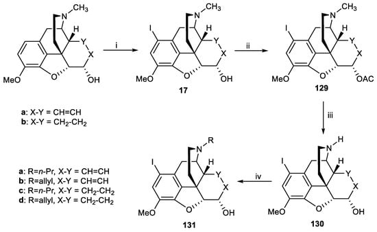 Aromatic iodides are chemically more reactive than chlorides and bromides. They are ideal intermediates for the synthesis of organometallic compounds or derivatization involving palladium-catalyzed reactions. In the past decades, several types of research have been conducted to synthesize novel 1-iodomorphine and codeine derivatives for nuclear medical imaging and radioimmunoassay [22,37,38].