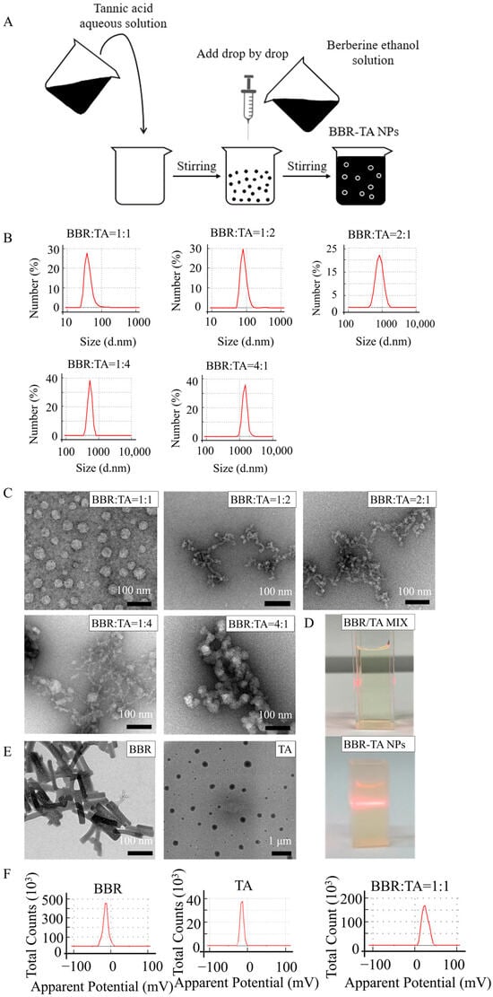 The characterization of BBR-TA NPs and their single components. (A) The schematic diagram of BBR-TA NP preparation process. (B) Particle size diagrams of nanoparticles composed of different proportions of BBR and TA. (C) Transmission electron microscopy diagrams of nanoparticles composed of BBR and TA in different proportions. (D) Tyndall effect diagrams of BBR/TA MIX and BBR-TA NPs (the molar ratio of BBR to TA is 1:1). (E) Transmission electron microscopy images of crude BBR and TA. (F) Zeta potential diagrams of BBR, TA, and BBR-TA NPs (the molar ratio of BBR to TA is 1:1).